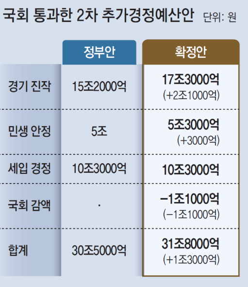 국회는 4일 31.8조원 규모의 2차 추가경정예산안(추경안)을 단독 처리하며, 전 국민 대상 소비쿠폰 지급을 본격화한다. 이재명 정부의 첫 추경안으로, 7월 말부터 1차 지급이 시작되며, 최대 55만원까지 지원된다.