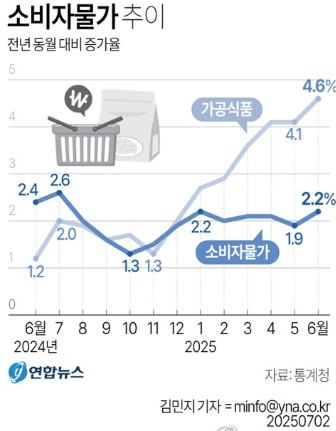 - 물가 급등: 6월 가공식품 가격 전년比 4.6%↑ (19개월 만에 최고)